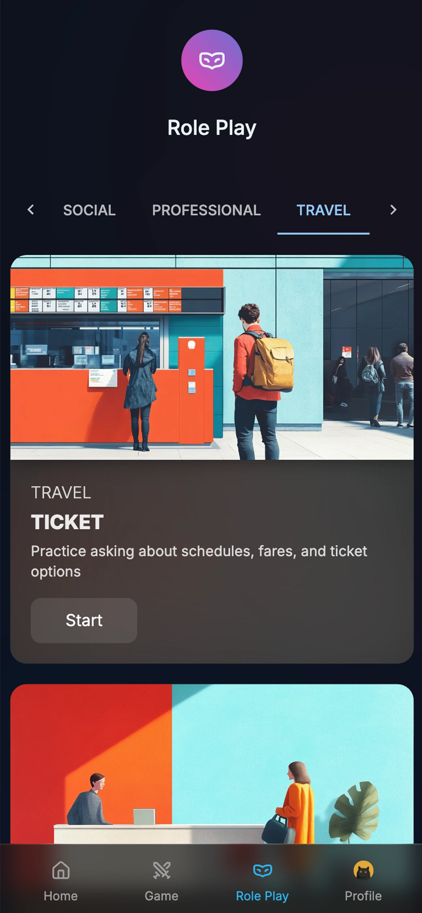 When you start, FluencyPal asks a short series of questions about your goals, current language level, and areas you want to improve. You answer using your voice. Based on your responses, FluencyPal creates a personalized practice plan for you. For example, business English focuses on professional vocabulary and scenarios, travel English focuses on real-life situations, and interview preparation simulates interview questions with feedback.